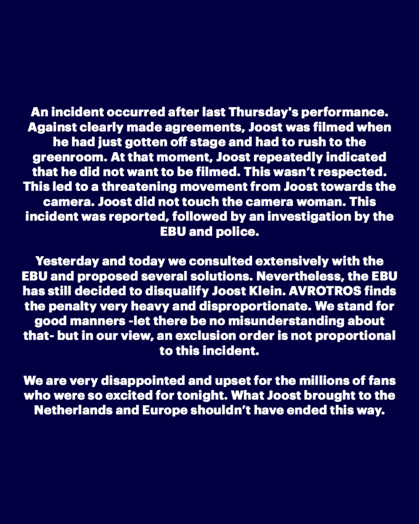 - Why did the EBU not promptly release a clear and unequivocal statement regarding what had happened between Joost and the crew woman? Even more egregiously, why were all sorts of awful, unfounded rumors (“he beat her/he sexually assaulted her/he is on drugs/she ended up in the hospital”) allowed to run rampant all over social media prior to the AVROTROS press release? Why was I left looking for updates on Instagram for hours? How do defamation laws work in Sweden?
