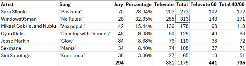 What happened at UMK (the Finnish national selection) this year is, however, unprecedented enough to warrant a bit of a deeper dive into the ways in which countries competing at ESC might have a selection process in place that is in practice a self-sabotaging trap. The ESC jury/televote split is essentially 50/50 (49.4/50.6 if we’re splitting hairs), ensuring that the winner will be an act that got comparable levels of support from industry experts as well as voters at home. Countries like Norway have slightly tweaked the ESC formula in favor of the televote (40/60 at Melodi Grand Prix) for the audience to have more of a say in the selection process. Unsurprisingly, these tweaks favoring songs that are generally crowd pleasers have, up to this point, failed to produce a Norwegian winner but have given us enduring, popular, beloved fan faves (Spirit in the Sky, Give That Wolf a Banana, Queen of Kings). That said, Finland has taken the ESC formula only to dramatically alter its balance – UMK chooses their competing act over a 25/75 jury/televote split. In theory, the contest is aiming to bolster the televote faves; in practice, this voting system is a huge waste of time, money, effort, and manpower. UMK has grown exponentially in estimation within the ESC fan bubble over the last few years: the show is and looks incredibly expensive, tickets usually sell out within the hour, and this year it found a new home at the Nokia Arena, the largest indoor arena in the country, to match record-high domestic TV ratings. In the end, Windows95man emerged as the winner, and let’s be clear – the math as laid out adds up and he won fair and square. Let’s look at the detailed final results for UMK 2024: